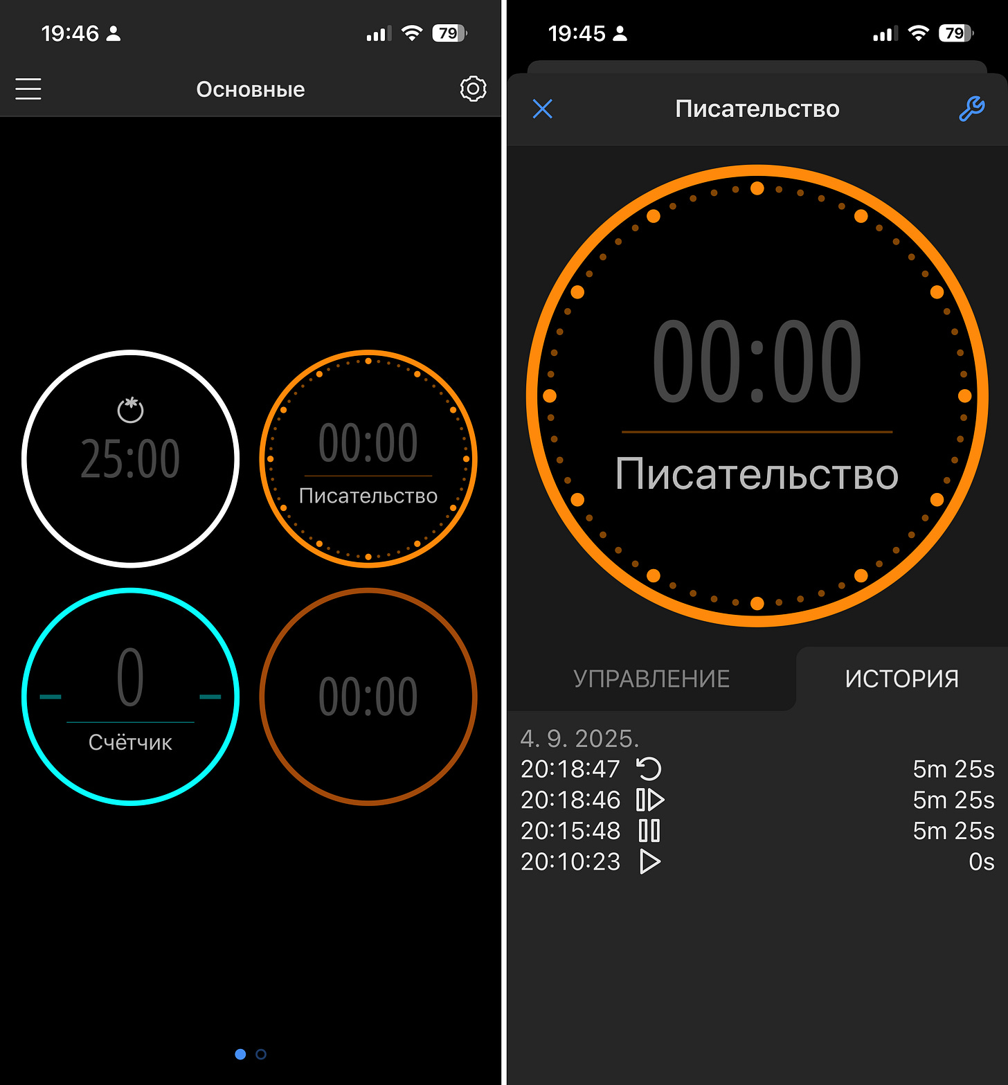 Если расширить щипком пальцев таймер, то открываешь управление и историю, что очень удобно.