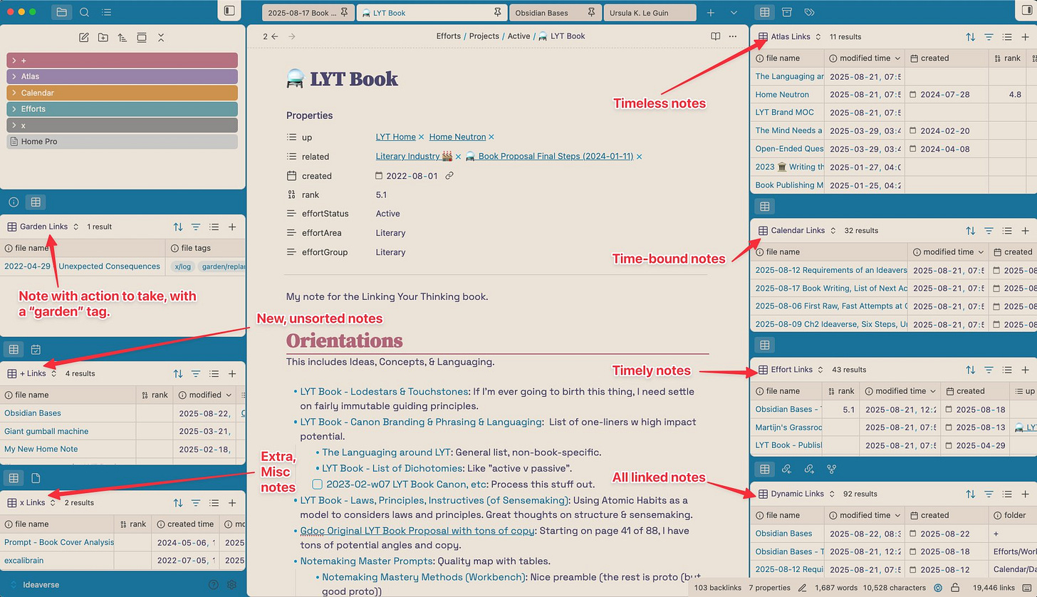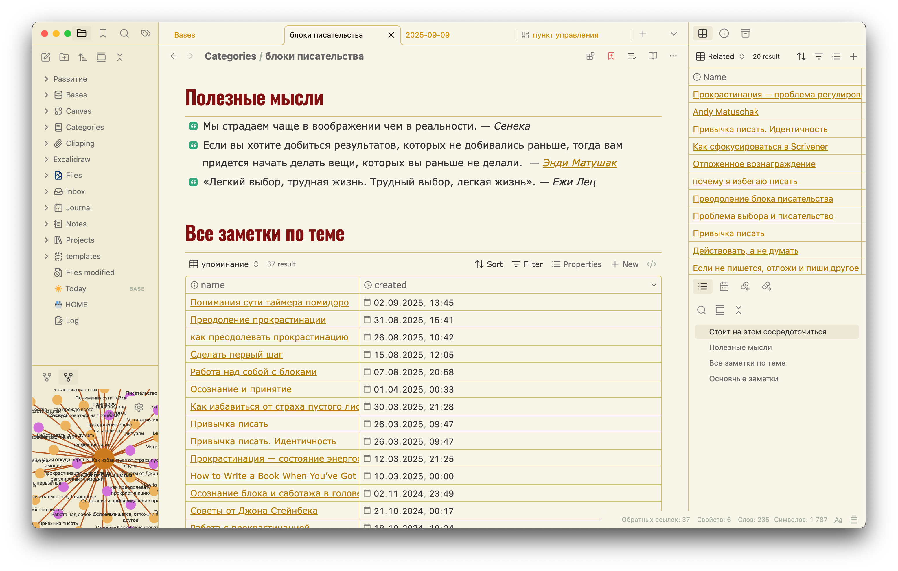 В папке категории у меня лежат заметки с названием категорий. Такие заметки относятся к moc (map of contents). Раньше я добавлял в каждую такую заметку dataview для сбора заметок, которые ссылаются на нее. Не всегда помогали бэклинки, чтобы отследить связанные заметки. Но с выходом Bases и появлением динамических ссылок, надобность в них отпадает.