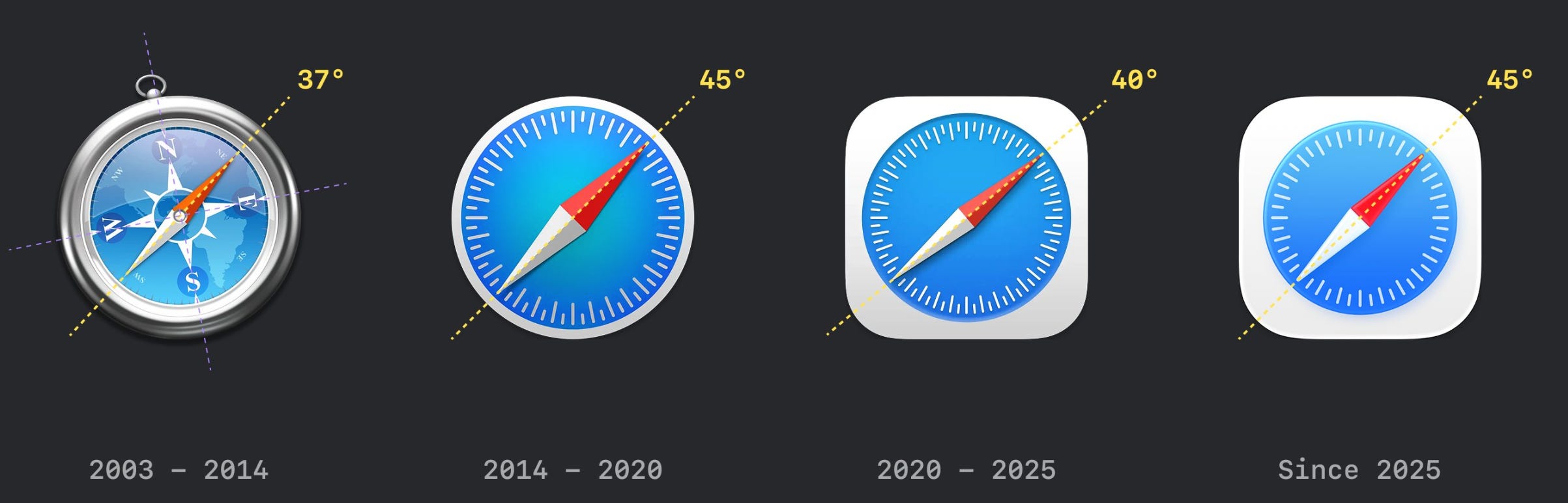 Никогда не обращал на это внимания, но каждое обновление значка приложения Safari на macOS поворачивало стрелку компаса на несколько градусов.